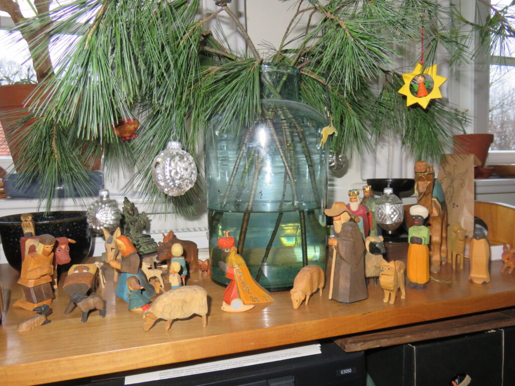 Die schönen Krippenfiguren stammen ursprünglich von meinen Schwiegereltern. Mein Ex-Mann hat sie an meine Tochter weitergegeben und sie hat sie bei mir aufgebaut. Auch wenn ich mich nicht als Christin verstehe (obwohl ich die Lehren des Mannes aus Nazareth für wichtig und richtig halte), finde ich so etwas schön. Weihnachten wurde lange vor Jesus gefeiert, als Geburt des neuen Lichts. Und alle Bräuche, die wir heute als christlich ansehen, sind viel älter als die Kirchen. Das Tannengrün, die Kerzen, das Festessen, die Geschenke – alles wurde von den Kirchen vereinnahmt, als Zugeständnis an die Menschen, die die alten schönen Bräuche beibehalten wollten.