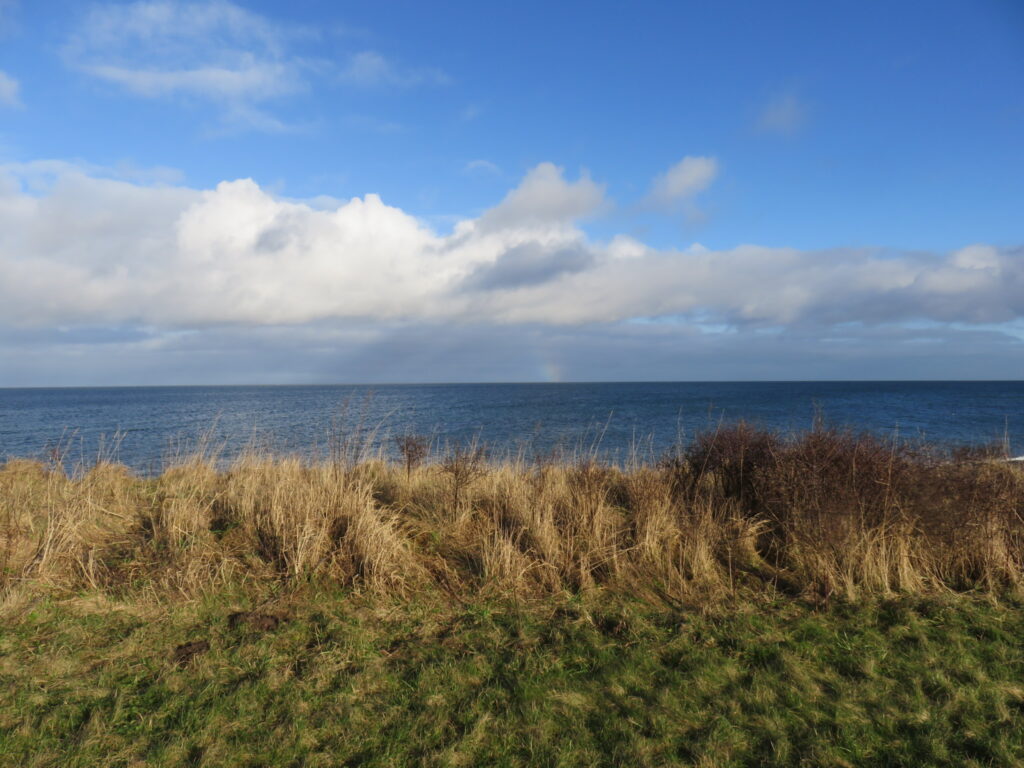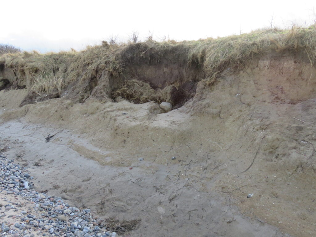 Heute fuhr ich ans Meer und machte dort einen langen Gang. Der Sturm, der kürzlich aus dem Osten kam, hat die Küstenlinie neu geformt: ich konnte die Gewalt des anflutenden Wassers angesichts der Spuren ahnen. An einer Stelle waren Ziegelsteine und Betonteile an der Abruchkante zu sehen, offensichtlich von Menschen angeordnet. Hier hat vielleicht mal ein Stall oder Ähnliches gestanden. Das Meer nimmt sich Jahr für Jahr Land zurück und erinnert uns so daran, daß nichts ewig besteht, daß alles dem Fluss von Werden und Vergehen folgt. An einigen Stellen, wo vor ein paar Jahren der Strand neu gestaltet wurde, hat die Flut die großen Steine verschoben und den groben Kies über die deichartige Aufschüttung auf den Acker geworfen. Jetzt werden die Stellen frei, wo man den Boden mit dickem Vlies bedeckt hat, vielleicht um unerwünschten Bewuchs zu unterbinden. Das Vlies ist nun zerrissen und zur Seite geweht, zu Zivilisationsmüll geworden.