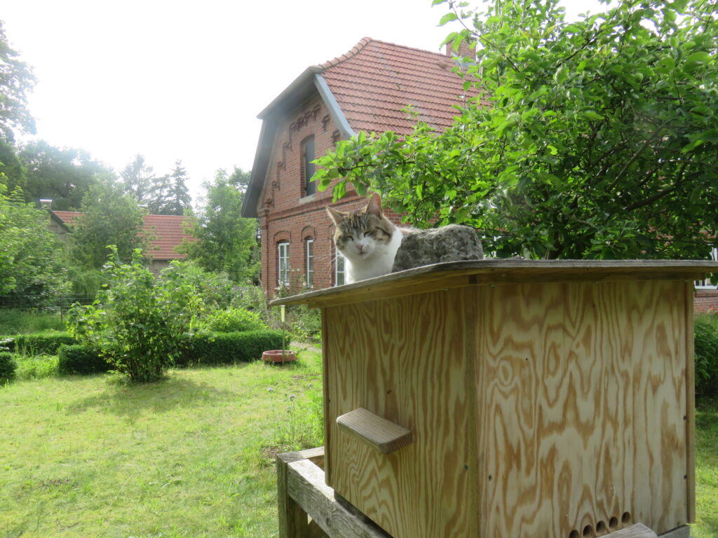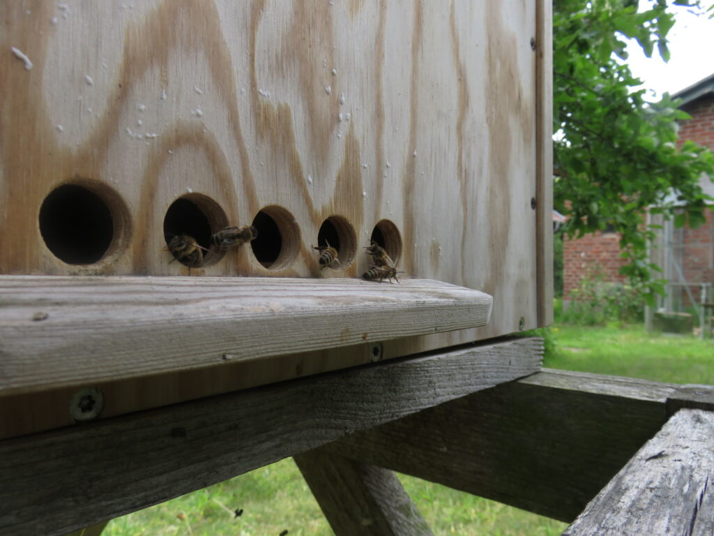 Der Bienenschwarm, den ich im Mai bekommen habe, hat überlebt. Das war einige Zeit nicht klar, da bei unserer umständlichen Schwarmfangaktion die Königin wohl nicht mit in den Kasten gekommen ist. Ohne Königin stirbt ein Volk. A. hat mir dann eine Wabe aus einem seiner Völker geschenkt, an der drei Weiselzellen hingen, also Zellen mit noch nicht geschlüpften Königinnen. Um die in meine Kiste einzufügen, musste ich einiges abschneiden, aber sie passte trotzdem nicht, weil meine Kiste schmaler ist. Von den Seiten konnte ich nichts abschneiden, weil da die Weiselzellen hingen. Also habe ich die Wabe etwas stauchen müssen und habe dann sehr gehofft, daß nichts kaputt gegangen ist. Es hat also geklappt und ich freue mich. Mein großer Dank geht an A.